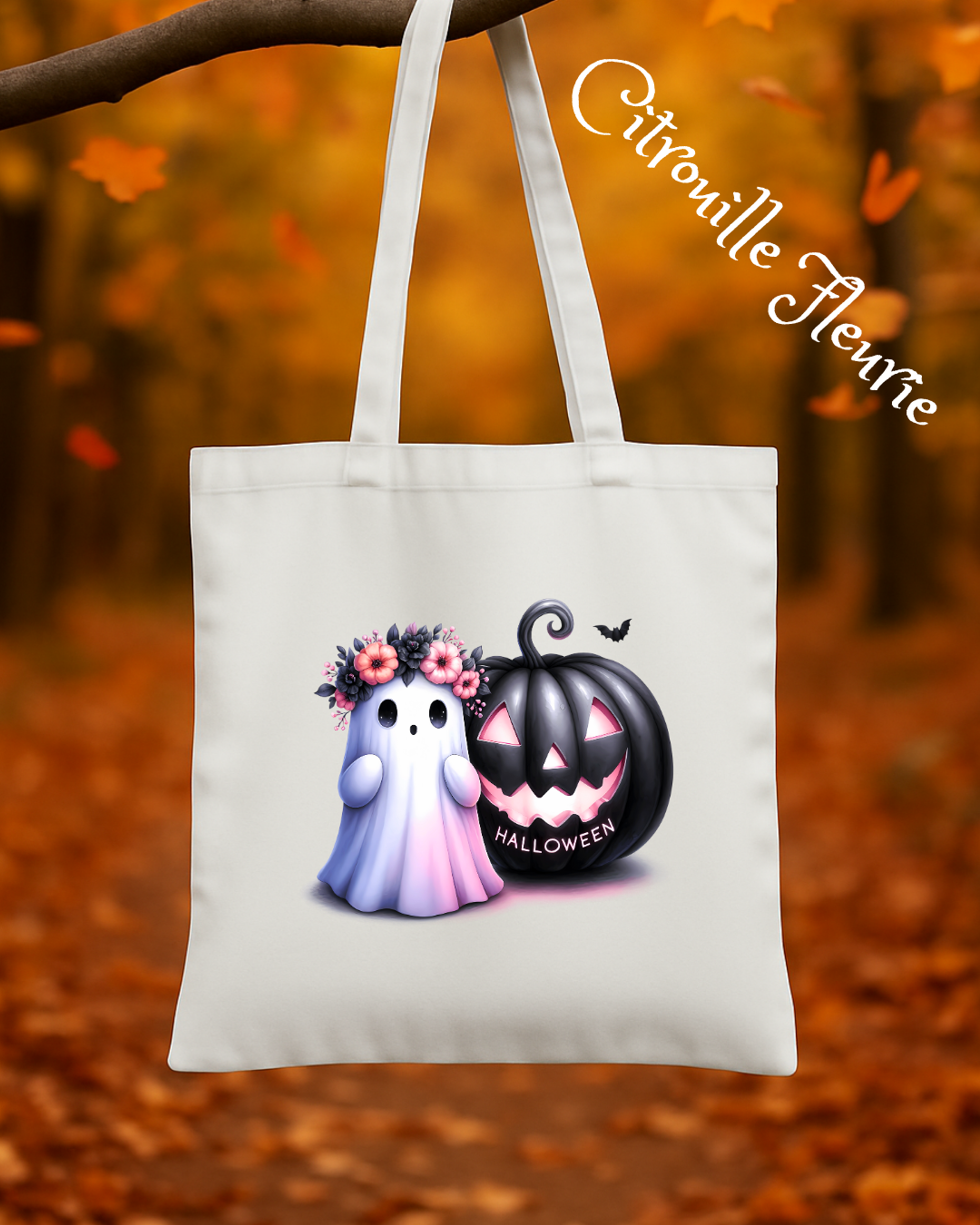 Avec son joli dégradé violet-rosé et sa couronne de fleurs, ce petit fantôme semble tout droit sorti d’un conte automnal. À ses côtés, une citrouille noire souriante, illuminée de rose, apporte une touche d’élégance dark. Ce tote bag marie avec poésie le floral pastel et l’ambiance Halloween.
