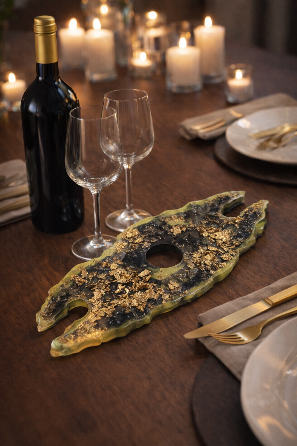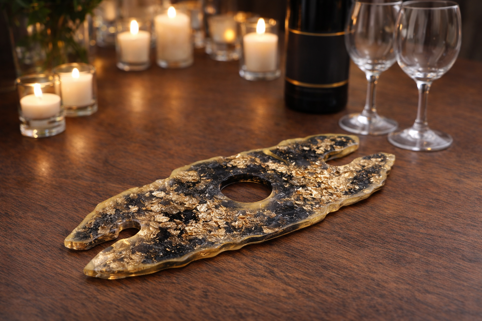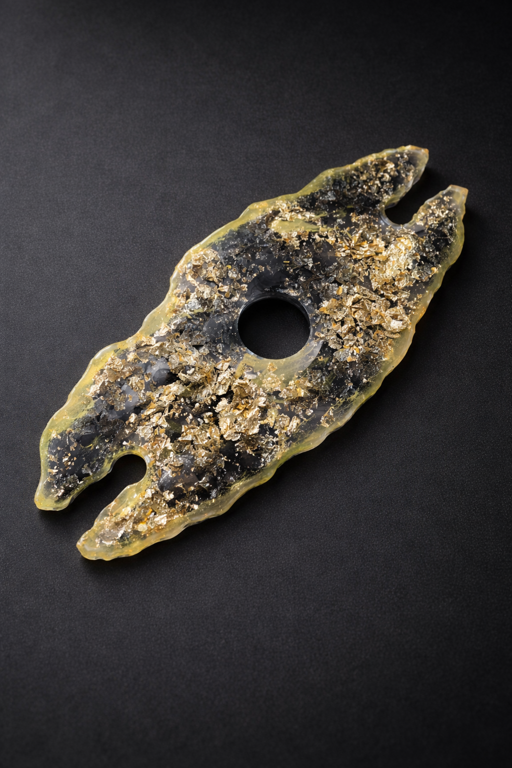 Résine aux nuances profondes, mêlant noir intense et reflets vert fumé, sublimée par des éclats dorés irréguliers.